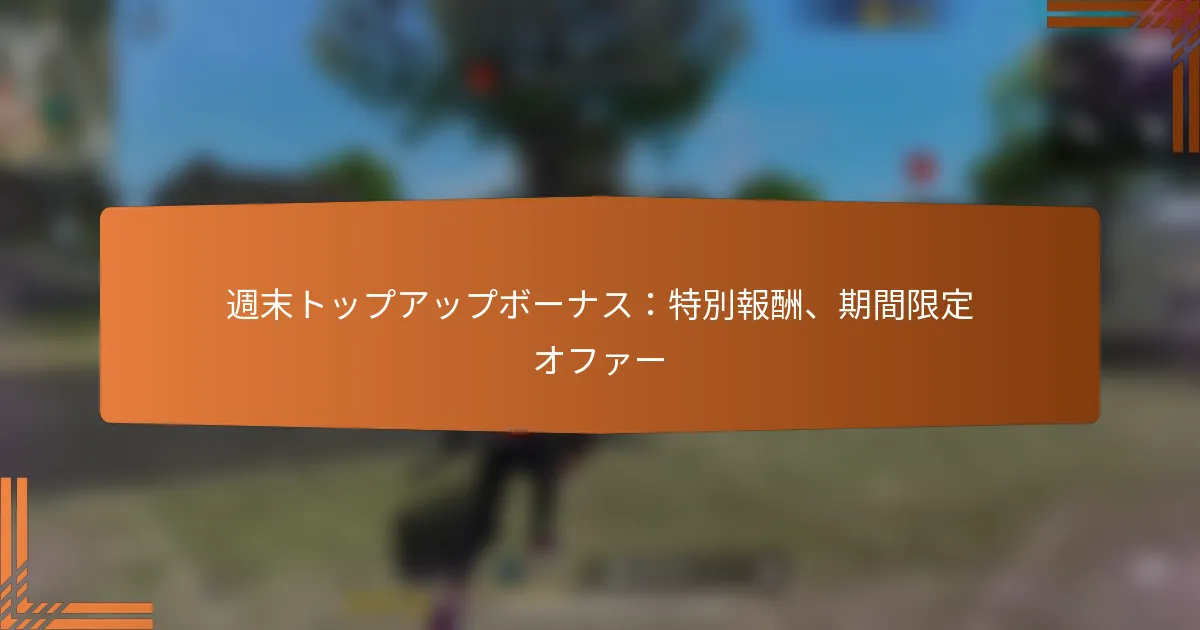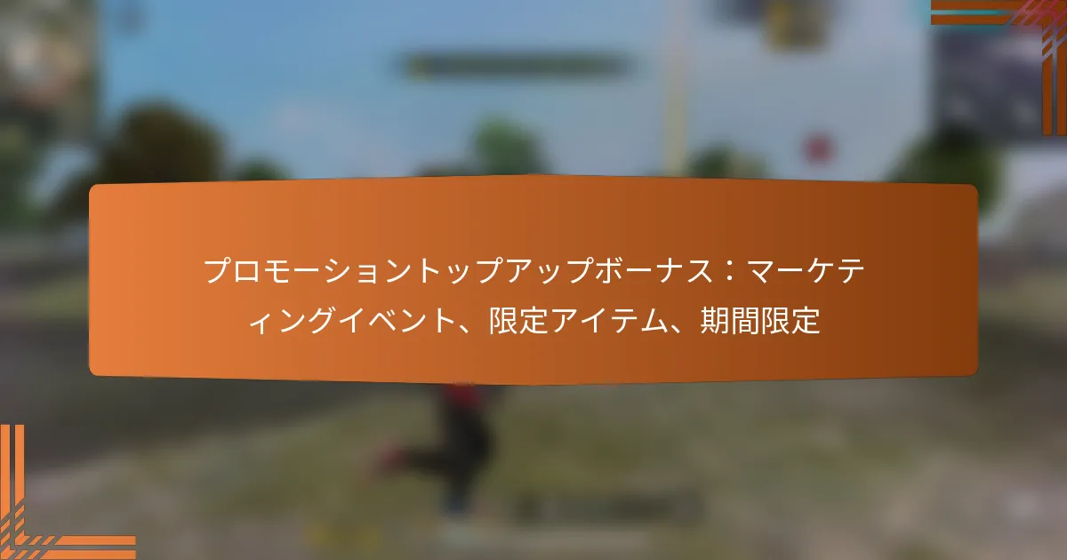 Garena Free Fire MAXのプロモーショントップアップボーナスを利用して、プレイヤーは特別なマーケティングイベント中に独占アイテムや追加のゲーム内通貨を獲得できます。これらの期間限定オファーは、ゲームプレイ体験を向上させるユニークな装備やキャラクターを提供します。ボーナスを受け取るには、資格のある入金を行い、これらのエキサイティングな報酬をアンロックするための必要な手順に従ってください。 Key sections in the article: Toggle Garena Free Fire MAXのプロモーショントップアップボーナスとは? プロモーショントップアップボーナスの定義と目的 プロモーショントップアップボーナスの仕組み 一般的なプロモーショントップアップボーナスの種類 プロモーショントップアップボーナスの資格基準 プロモーショントップアップボーナスを利用する利点 プロモーショントップアップボーナスをどのように受け取ることができますか? ボーナスを受け取るためのステップバイステッププロセス ボーナスの資格を得るために必要なアクション 受け取り時に避けるべき一般的な間違い ボーナス受け取り後の確認手順 プロモーショントップアップボーナスで入手できる独占アイテムは何ですか? 提供される独占アイテムのリスト ボーナスを通じて独占アイテムを取得する方法 独占アイテムの価値と希少性 独占アイテムと通常アイテムの比較 プロモーショントップアップボーナスに関連するマーケティングイベントは何ですか? ボーナスに関連するマーケティングイベントの概要 プロモーションイベントの日程と場所 マーケティングイベントに参加する方法 プロモーションイベントに参加する利点 プロモーショントップアップボーナスの時間制限は何ですか? プロモーションオファーの期間 ボーナスを受け取るための締切 Garena Free Fire MAXのプロモーショントップアップボーナスとは? Garena Free Fire MAXのプロモーショントップアップボーナスは、プレイヤーがゲーム内通貨やアイテムを購入する際に提供されるインセンティブです。これらのボーナスには、特別なマーケティングイベント中に限定アイテムや追加の通貨が含まれることが多いです。 プロモーショントップアップボーナスの定義と目的 プロモーショントップアップボーナスは、プレイヤーがゲーム内購入にお金を使うことを促すために設計されています。通常、リアルマネーでアカウントをトップアップする際に、プレイヤーに追加の報酬や独占アイテムを提供します。 これらのボーナスの目的は、購入をより魅力的にすることでプレイヤーのエンゲージメントとリテンションを向上させることです。ユニークなアイテムやボーナスを提供することで、開発者はゲーム内支出に対する緊急性と興奮を生み出すことを目指しています。 プロモーショントップアップボーナスの仕組み プロモーショントップアップボーナスを利用するには、プレイヤーはプロモーション期間中にゲーム内通貨を購入する必要があります。購入が完了すると、ボーナス報酬は自動的にプレイヤーのアカウントにクレジットされます。 プロモーションには特定の期間があるため、プレイヤーはボーナスを確保するために迅速に行動する必要があります。各プロモーションの詳細を確認することが重要で、報酬や資格を得るために必要な金額が異なる場合があります。 一般的なプロモーショントップアップボーナスの種類 独占アイテム:プロモーション期間中のみ入手可能なユニークなスキン、キャラクター、またはその他のゲーム内資産。 ボーナス通貨:購入時に提供される追加のゲーム内通貨、通常はパーセンテージ形式で。 期間限定オファー:短期間の特別な割引やバンドルアイテムを含む特別な取引。 これらのボーナスは、ゲーム体験を向上させるだけでなく、プレイヤーに競争上の優位性や美的アップグレードを提供します。 プロモーショントップアップボーナスの資格基準 プロモーショントップアップボーナスの資格を得るには、通常、指定されたプロモーション期間内に資格のある購入を行う必要があります。各プロモーションには異なる最低支出額や満たすべき条件がある場合があります。 プレイヤーはまた、アカウントが良好な状態であることを確認する必要があります。なぜなら、一部のプロモーションでは、未解決の問題やゲームの利用規約に違反しているアカウントは除外されることがあるからです。 プロモーショントップアップボーナスを利用する利点 プロモーショントップアップボーナスを利用することで、ゲーム内購入の価値を大幅に向上させることができます。プレイヤーは同じ金額でより多くのアイテムや通貨を受け取ることができ、ゲームへの投資を最大化します。 さらに、これらのボーナスは、ゲームプレイやカスタマイズオプションを向上させる独占コンテンツへのアクセスを提供することが多く、ゲーム体験をより楽しいものにします。 報酬を最大
